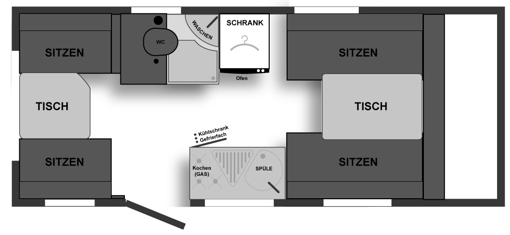 Auf dem 3-Flammenherd lassen sich optimal kulinarische Delikatessen kreieren und im Kühlschrank inklusive Gefrierfach ist für alles, was das Herz begehrt ausreichend Platz. Der Frischwassertank ist mit 20 Litern Fassungsvermögen groß genug, um eine 5köpfige Familie mit ausreichend Wasser zu versorgen.