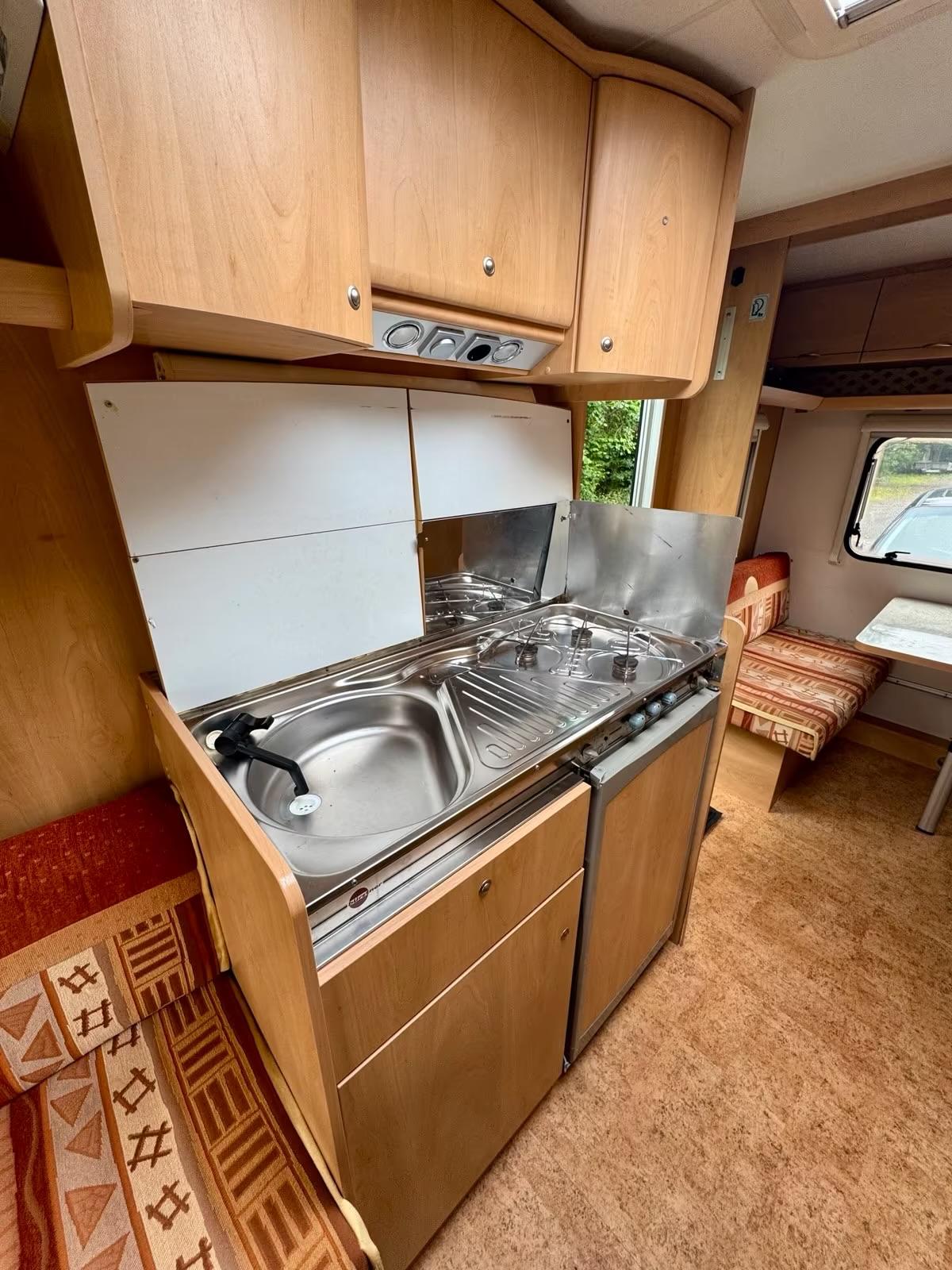Auf dem 3-Flammenherd lassen sich optimal kulinarische Delikatessen kreieren und im Kühlschrank inklusive Gefrierfach ist für alles, was das Herz begehrt ausreichend Platz. Der Frischwassertank ist mit 20 Litern Fassungsvermögen groß genug, um eine 5köpfige Familie mit ausreichend Wasser zu versorgen.